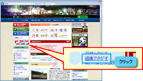 トップページから下図のように、「おいらせ町の組織一覧」をクリックしてください。